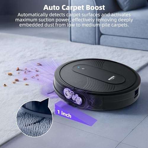 ✨【Adaptive Carpet Boost】➤MR1 SE robot cleaner climbs 1-inch thresholds, rugs, and cords without getting stuck, while its intelligent carpet sensor automatically cranks up suction to max power on carpets—ripping out deep dirt, pet hair, and debris others miss