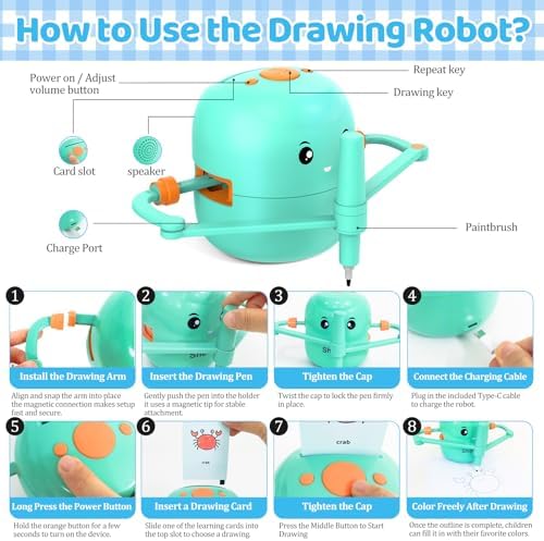 GREAT GIFT FOR AGES 3 AND UP – Whether it’s for a birthday, Christmas, or a learning milestone, this drawing robot is more than a toy—it fills children’s free time with creativity, teaches them new artistic skills, and gently accompanies them through play and discovery. This drawing robot is not only a cute companion for children, but also allows children to learn to draw while playing games.