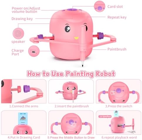 🤖 【𝗨𝘀𝗲𝗿-𝗙𝗿𝗶𝗲𝗻𝗱𝗹𝘆 𝗢𝗽𝗲𝗿𝗮𝘁𝗶𝗼𝗻】Effortlessly start the fun—no apps needed! Simply insert one of the 150 included drawing cards featuring a wide range of subjects such as animals, plants, transportation, and more. Our robot makes it easy for children to enhance their graphic recognition and color perception.