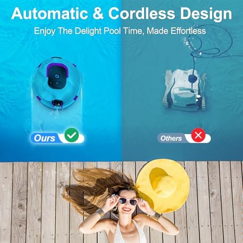 【Truly Cordless & Ready in Seconds】- No hoses, pumps, or installation. Just press the switch, submerge it underwater to activate(The indicator light ensures proper operation.), and enjoy a spotless pool! Designed for fast, low-maintenance cleaning, this Ezioov Y20 cordless robotic pool cleaner lets you say goodbye to the hassle of messy cords