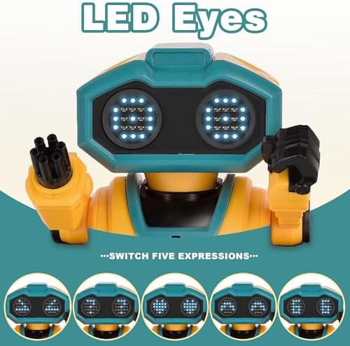 [Practical Design] – 6-wheel tank track structure, LED light-up eyes, five switchable expressions, manual launch design, built-in4 stories and 3 music pieces, the robot needs to be powered by a 3.7v rechargeable battery (included)