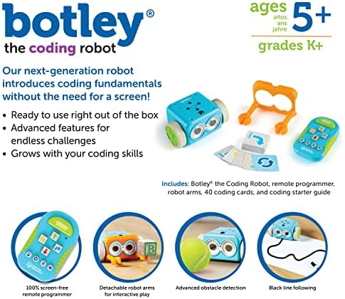 Meet Botley, the code to fun! As the newest member of the Learning Resources family, Botley introduces coding in an easy, friendly way that children as young as 5 can understand. With his advanced features, Botley grows with your child for many play-filled years to come. Ready to use straight out of the box (just add 5 AAA batteries), Botley gets kids coding within minutes without requiring any screens – no phone or tablet needed! Botley comes with a comprehensive 45-piece activity set including coding cards, obstacles, and accessories that transform learning into an exciting hands-on experience. Kids will be amazed as they program Botley to complete up to 80 steps, follow looping commands, and navigate around objects using if/then logic. The included remote programmer makes inputting commands simple and intuitive, while the 40 coding cards help children visualize and plan their sequences before execution. One of Botley’s most captivating features is his black-line follow mode, where children can create custom paths for him to travel. Kids love watching as Botley makes adorable sounds, lights up, and responds to their programming with charming personality. Parents appreciate that Botley fosters creativity, develops critical thinking skills, and builds problem-solving abilities!