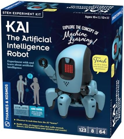 Explore the future of advanced computing technology with KAI — short for Kosmos Artificial Intelligence! Build and program an intelligent, six-legged, app-enabled robot that uses machine learning to react to the gestures and sounds that you make. Machine learning is the process by which computers use data to recognize patterns, learn, and make predictions, and it is a key aspect of artificial intelligence. Using the app and your smart device’s camera and microphone, record physical gestures and sounds, assigning them to KAI’s five functions: walk forward and backward, turn left and right, and stop. The AI will learn to recognize each gesture or sound, even if they differ in small details. The more data you collect, the better the AI will learn from it. Use the data collected to create an AI model in the training screen of the app, where the AI takes your data and recognizes patterns in it. The learning curve shows you how accurately the AI model is learning, and you can use the sliders to adjust the number of times it will analyze the data and how quickly the training should run to get better results. Then put your AI model to the test in play mode by controlling your robot remotely. Just perform the same gestures or sounds that you did when collecting data, and your robot will perform the assigned function! You can also control KAI directly using the remote-control function in the app or by using your smart device as a gyroscope, tilting it in the direction you want it to move in. Mechanically, KAI is a fascinating robot that can walk on six legs and rotate its upper body around 360 degrees, allowing it to turn toward any direction on the spot. Composed of 25 red LEDs, its face display can be programmed via the app to show different expressions and scrolling messages. A full-color, 64-page manual provides step-by-step illustrated assembly and programming instructions, teaches lessons in AI and robotics, and includes a fun, comic-book-style story that brings KAI to life. Read about the history and future of AI and its real-world applications. The app requires a tablet (recommended) or smartphone running iOS or Android. Please check the app stores for compatibility and device requirements.