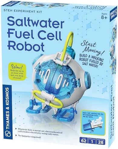 Build a sleek, modern (and adorable!) walking robot powered by salt water and magnesium — no batteries required! Discover how a metal-air electrochemical cell stores and discharges electrical energy using a simple saltwater solution. Explore the science of electricity, currents, and electric potential. An innovative pump mechanism provides a steady drip of salt water onto the magnesium plates and the robot walks for up to one hour on just one drop of salt water! The “fuel” bottle is easy to clean, refill, and reuse for hours of exploration. A full-color manual includes step-by-step assembly instructions and delves into how this green technology offers a truly safe, non-toxic, long-lasting, and renewable source of energy.